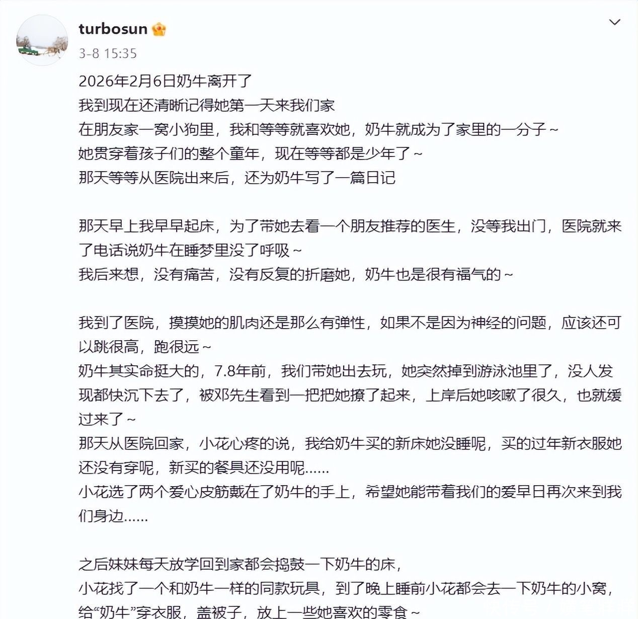 孙俪在文中披露,奶牛实于2月6日凌晨安详辞世,是在熟睡中悄然告别世界的,全程未经历病痛煎熬,亦无反复挣扎的苦楚。